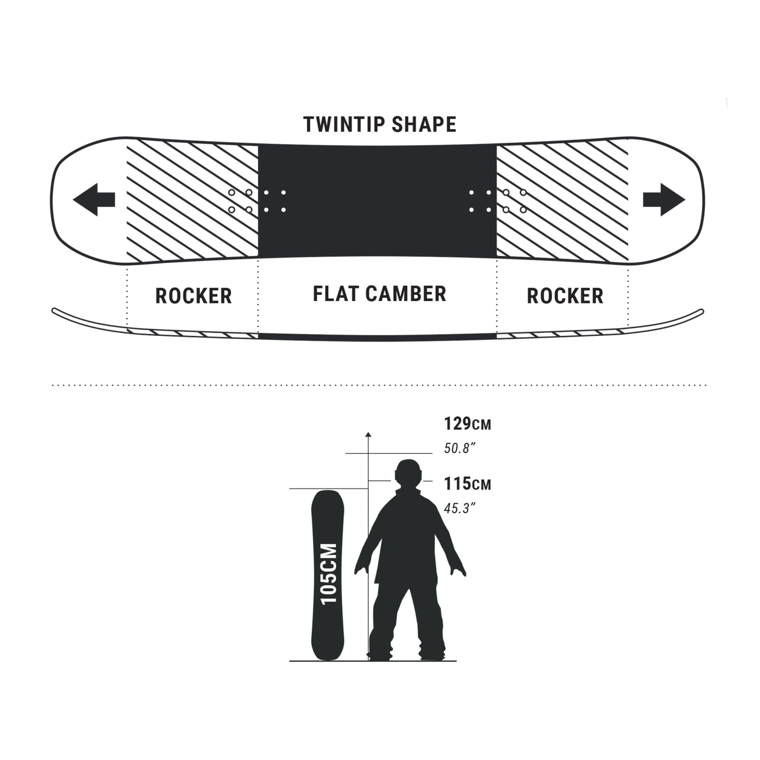 This Decathlon snowboard is for kids 1.15 m to 1.29 m tall. It’s the perfect beginner snowboard to help young athletes learn and progress. Flat camber with twin tips (nose and tail) to avoid catching an edge for smooth sailing on flat areas. Small bend radius for better handling and carving.